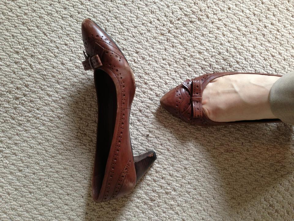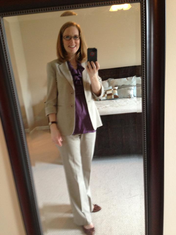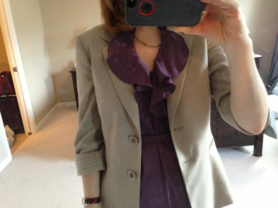 Dear Meghan, I am indeed a proud Auntie PeaceBang! I love this outfit. It’s terrific. It’s strong and structured yet with a bit of flouncy detail that is subtle, feminizing and flattering. Too much design element in the suit or the blouse could have overwhelmed you, but both are perfect in terms of proportion and the way they bring some visual interest to your face (the soft frills of the neckline — GREAT pop of bold, strong color and not too much frill) and hands (bit o’ cuff design) — both nice areas of focus for a preacher. The neutral color is great for all seasons, and your shoes are professional, attractive, smart and — I’m guessing — reasonably comfortable.